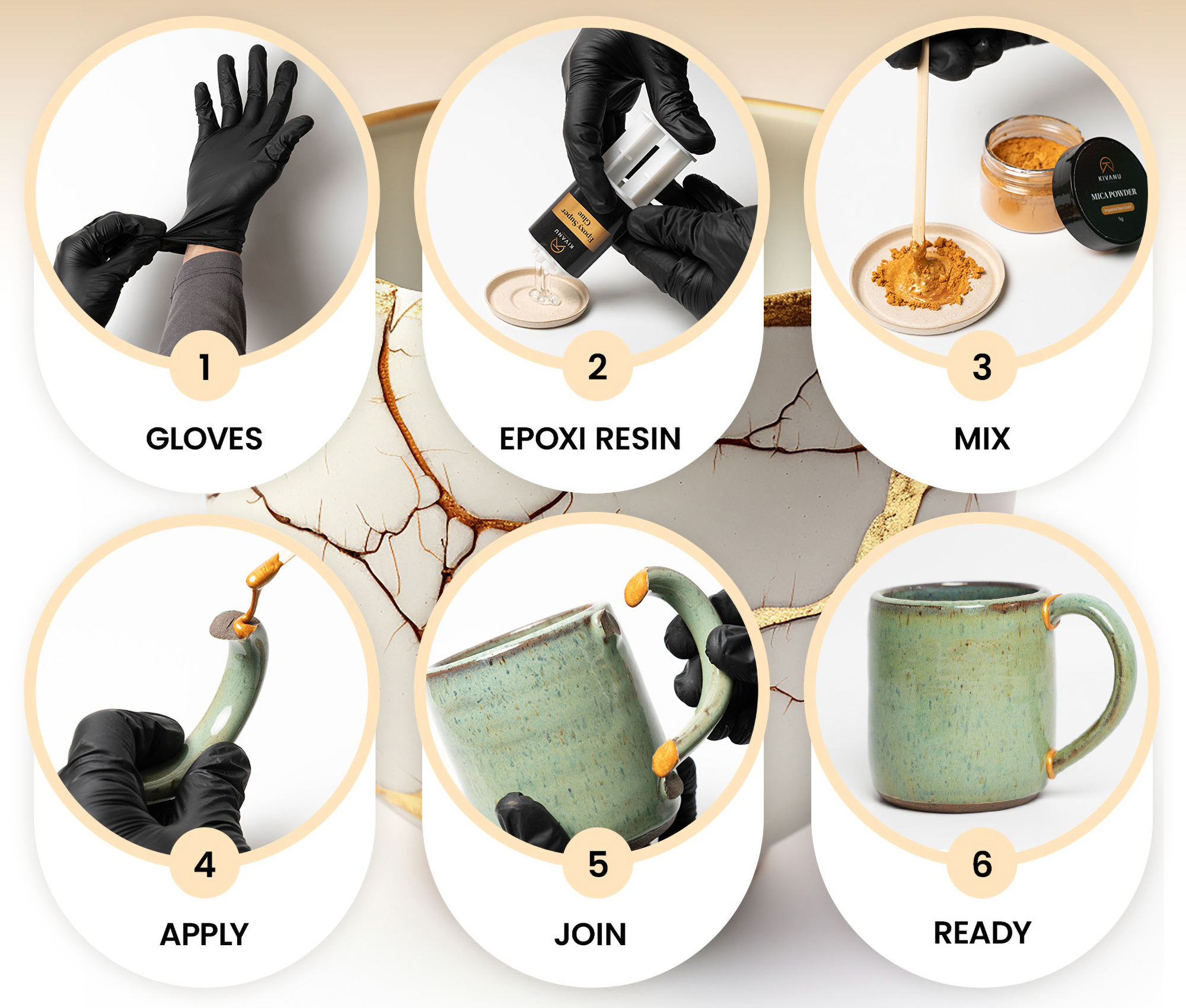 Begin with clean, dry ceramic pieces. Mix the epoxy resin according to the guide, apply a thin layer along the edges, and gently join the parts together. Once cured, brush your chosen metallic pigment to reveal the beauty in the repaired lines.